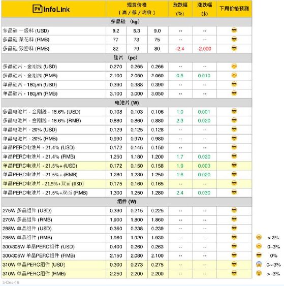 硅料價格 本周硅料價格又開始有些微滑落,致密料降幅約2塊人民幣,價格范圍在每公斤79-82元人民幣,致密料微跌的態(tài)勢可能在短期內(nèi)皆是如此。菜花料部分,雖然因?yàn)槎嗑Мa(chǎn)品需求提升,加上部分單晶廠采用菜花料的支撐,本周價格沒有下跌,但預(yù)計12月底前價格仍有可能小幅下修。目前致密料與菜花料的價差再度縮小至每公斤5元人民幣。海外部分,價格保持,但成交明顯增加,成交價格仍在每公斤8.3-9美元之間。 硅片價格 本周國內(nèi)多晶硅片價格有小幅上漲,主因在于多晶產(chǎn)品的需求提升,兩家多晶硅片大廠提升了價格,但其余多晶硅片廠則仍保持在上周水平。其中協(xié)鑫、榮德目前價格約在每片2.1元人民幣左右,其他成交價格則多在每片2.05-2.08元之間。 海外的多晶硅片價格,因?yàn)閰R率回升,目前訂單價格多維持在每片0.265-0.27美元之間。多晶硅片在需求及匯率的助攻下,下周有望繼續(xù)小幅反彈。單晶硅片本周則基本沒有變化。 電池片價格 11月中旬開始,市場逐漸感受到多晶需求小有增溫,加上先前陸續(xù)有電池廠逐漸減少多晶電池片制造或轉(zhuǎn)換為單晶PERC,使得多晶電池片重回供需平衡的狀態(tài),而受到年底需求優(yōu)于預(yù)期影響,12月多晶電池片、單晶PERC電池片價格成功上漲。 12月轉(zhuǎn)換效率18.7%之多晶電池片成交價格全面站上每瓦0.88元人民幣、0.105-0.107美金。然而,不論是針對海外或國內(nèi)市場,多晶電池片訂單大多以年底前的需求為主,故須觀察12月中旬后多晶電池片需求是否會稍有轉(zhuǎn)弱。 PERC電池片部分,由于SE-PERC的比重快速拉升,市場上轉(zhuǎn)換效率21.2%-21.4%的普通PERC電池片供應(yīng)銳減,本月價格也小有上揚(yáng),達(dá)到1.18-1.2元人民幣。 高效PERC電池片得利于領(lǐng)跑者需求的支撐,價格上漲幅度明顯,本周轉(zhuǎn)換效率21.5%+的PERC單面電池片上漲至1.25-1.28元人民幣上下。 海外PERC電池片價格也一同起漲,尤其臺灣市場適逢年底拉貨潮,需求火熱,臺灣單晶PERC電池片價格站上每瓦0.168-0.172元美金。 組件價格 組件部分,四季度國內(nèi)內(nèi)需情況不差,加上過去歐洲訂單大多依賴東南亞產(chǎn)能出貨、現(xiàn)在則可用成本更低的中國本土產(chǎn)能直接輸歐,使得四季度國內(nèi)一、二線組件大廠開工率優(yōu)于預(yù)期,目前海內(nèi)外各樣組件價格都較為持穩(wěn)。 然而,近期不僅電池片漲價,多數(shù)玻璃廠家成交價在12月也上漲了10-15%,墊高組件廠成本。且近日陸續(xù)傳出明年交貨的多晶組件成交價格明顯走低,因此明年多晶組件的價格走勢仍需審慎看待。 *黃色欄位為本周新增項(xiàng)目,更動如下: Cell 1.因應(yīng)市場效率提升,多晶電池片效率改為18.7%。 2.新增效率21.5%以上單面、雙面單晶PERC電池片美金價格。 Module 因應(yīng)市場效率提升,新增310W 單晶PERC組件美金及人民幣價格。