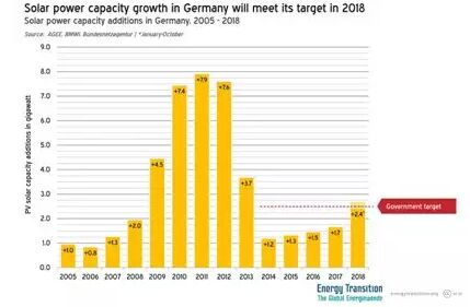 2018年對德國光伏有著重要的意義。這一年,是德國自2014年以來五年中首年光伏裝機超過2GW的節(jié)點。這一年,可再生能源發(fā)電量占比超過40%,德國可再生能源事業(yè)取得了亮眼的成績。 最重要的是,讓我們記住2018年的原因,是2018年可能是未來十年德國光伏的新起點。2014~2018年裝機量在節(jié)節(jié)爬升的趨勢下,2019年光伏又將如何發(fā)展? 西方戰(zhàn)車覺醒 首次達到2.5GW目標 德國光伏也曾經(jīng)歷過大躍進的年代,2009年新增裝機4.5吉瓦,2010-2012年連續(xù)三年新增裝機超過7吉瓦,是德國光伏發(fā)展的高光時刻。此后,由于光伏趨勢的調(diào)整,2013年作為緩沖,2014年光伏裝機量顯現(xiàn)出斷崖式下跌。隨后德國政府為新增光伏設立了2.5吉瓦的目標,但是2014-2017年連續(xù)四年新增裝機均低于2吉瓦。 2018年,這一低迷狀態(tài)終于好轉(zhuǎn)。