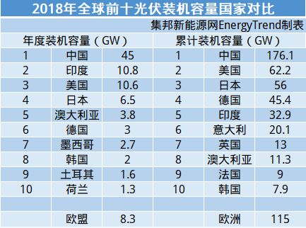 近日,IEA公布了2018年的光伏裝機(jī)情況,前十名分別是:中國(guó)、印度、美國(guó)、日本、澳大利亞、德國(guó)、墨西哥、韓國(guó)、土耳其、荷蘭。