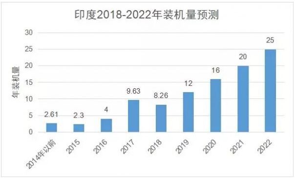 2015年7月印度政府推出了宏大國(guó)家太陽(yáng)能計(jì)劃:至2022年,總裝機(jī)容量將達(dá)到100GW;到2030年,計(jì)劃超過(guò)300GW。。! 然而,截止2018年底,印度實(shí)際裝機(jī)總量約26.8GW,也就是說(shuō),在印度計(jì)劃在2019到2022年四年內(nèi)平均每年招標(biāo)18GW太陽(yáng)能項(xiàng)目。根據(jù)過(guò)去幾年的裝機(jī)量趨勢(shì)按照線性增長(zhǎng)的趨勢(shì),從2019年-2022年印度國(guó)內(nèi)的光伏需求如下圖所示: