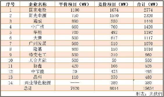 備注:表格中數(shù)據(jù)多以企業(yè)財(cái)報(bào)、社會(huì)責(zé)任報(bào)告數(shù)據(jù)為準(zhǔn),部分?jǐn)?shù)據(jù)通過(guò)企業(yè)官網(wǎng)以及采訪渠道獲得;另有部分地方龍頭能源企業(yè)數(shù)據(jù)暫無(wú)法通過(guò)官方數(shù)據(jù)獲得,故未列出,上述數(shù)據(jù)僅供參考。 首先,從2018年下半年開(kāi)始,迫于資金壓力,民營(yíng)企業(yè)出售光伏電站的消息絡(luò)繹不絕。其中以協(xié)鑫新能源-華能的交易最為典型,這家國(guó)內(nèi)最大的光伏電站民營(yíng)投資企業(yè)在被拖欠逾百億的補(bǔ)貼資金之后,不得已選擇出售公司股權(quán)來(lái)緩解資金壓力。而在這些交易中,接盤(pán)方多為央企/國(guó)企; 其次,從2019年競(jìng)價(jià)、平價(jià)名單可以看出,新增光伏電站的開(kāi)發(fā)主動(dòng)權(quán)更多的集中到了國(guó)有企業(yè)手中。央企發(fā)電集團(tuán)中,國(guó)家電投領(lǐng)銜,中廣核、華能、大唐、三峽、中節(jié)能等均積極的參與到了2019年的光伏電站競(jìng)爭(zhēng)中。 表2:2019年第一批平價(jià)、競(jìng)價(jià)項(xiàng)目中入選規(guī)模排名前列的投資企業(yè)