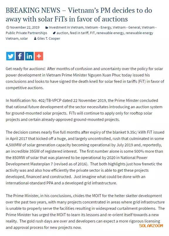 經(jīng)過(guò)近幾個(gè)月來(lái)光伏發(fā)展政策的混亂和不確定性之后,越南總理阮春福(Nguyen XuanPhuc)11月22日發(fā)布了他的結(jié)論,為了發(fā)展競(jìng)價(jià)光伏項(xiàng)目,原來(lái)的固定上網(wǎng)電價(jià)補(bǔ)貼(FiT)似乎走到了盡頭。 在當(dāng)日的第402/TB-VPCP號(hào)通知中,阮春福表示為了光伏產(chǎn)業(yè)的合理發(fā)展,需要對(duì)地面光伏項(xiàng)目引入競(jìng)價(jià)機(jī)制,上網(wǎng)電價(jià)補(bǔ)貼將只適用于屋頂太陽(yáng)能項(xiàng)目和某些已經(jīng)獲得批準(zhǔn)的地面安裝項(xiàng)目。