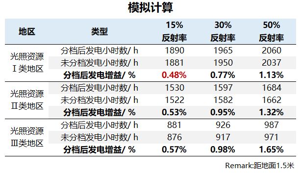在模擬計(jì)算中,雙面組件疊加雙面雙測(cè)雙分檔技術(shù)在一類(lèi)地區(qū)可較背面未分檔組件增發(fā)0.48-1.13%;二類(lèi)地區(qū)增發(fā)0.53-1.32%;三類(lèi)地區(qū)增發(fā)0.57-1.65%。在日照二三類(lèi)地區(qū),分檔增發(fā)比例更明顯。