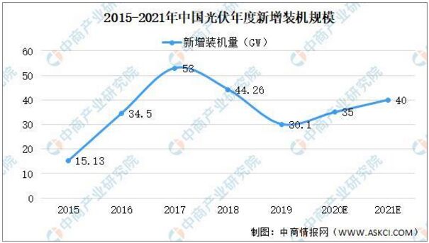 光伏行業(yè)是結合新能源發(fā)電與半導體技術的戰(zhàn)略性新興行業(yè),也是受到國家產(chǎn)業(yè)政策和財政政策重點支持的新能源行業(yè),光伏發(fā)電具有可持續(xù)性、清潔性和無地域限制等突出優(yōu)勢。 (一)發(fā)展狀況 (1)市場規(guī)模 2019年,受平價上網(wǎng)政策影響,全國光伏新增裝機量有所下滑,維持在30.1GW,較2018年下降31.97%。2020年在未建成的2019年競價項目、特高壓項目,以及新增競價項目、平價項目等拉動下,預計國內(nèi)新增光伏市場將實現(xiàn)恢復性增長,預計2020年全國新增裝機量將超過35GW,2021年將達到40GW。