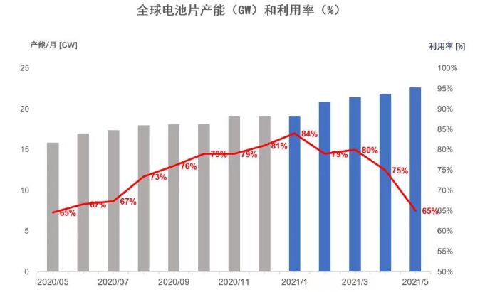 備注:根據(jù)賀利氏內(nèi)部數(shù)據(jù),6月份全球太陽能電池片產(chǎn)能利用率進一步下降,目前產(chǎn)能利用率保持在65%左右