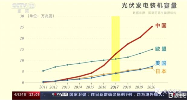 2011年,中國的裝機容量僅為日本、美國的六成,為歐盟的6%。從2013年起,國家加大節(jié)能減排力度,光伏產(chǎn)業(yè)快速發(fā)展。到2017年,中國的裝機容量就超過了整個歐盟的總和。