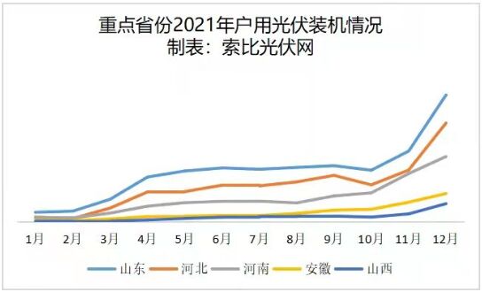 從2021年各省戶用光伏裝機(jī)規(guī)?,山東、河北、河南依然是最核心的三個(gè)主力市場(chǎng),安徽、山西、江西、福建、江蘇等5個(gè)省也實(shí)現(xiàn)了裝機(jī)超400MW、占比超2%的目標(biāo)。