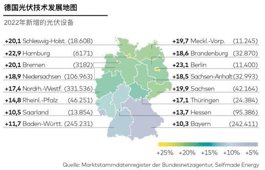 2022年是人們突然對能源開始敏感并關(guān)注的一年。俯瞰德國,北部地區(qū)的光伏發(fā)電增長是南部的兩倍:下薩克森州、梅前州、石荷州和其他城市州的光伏系統(tǒng)增加了約 20% ,而在巴伐利亞州的光伏發(fā)電增長僅為10%,巴符州也只11%。但南部聯(lián)邦州太陽能屋頂?shù)慕^對數(shù)量遠(yuǎn)遠(yuǎn)高于北部。巴伐利亞和巴符兩州的太陽能屋頂均達(dá)到25萬個(gè)。北威州最厲害,擁有的太陽能屋頂高居33萬個(gè)。