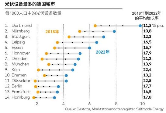 在人口超過50萬的大都市中,科隆在2022年的太陽能發(fā)電增長最為強(qiáng)勁,達(dá)到 29%。杜塞爾多夫和德累斯頓分別以25%和24%緊隨其后。