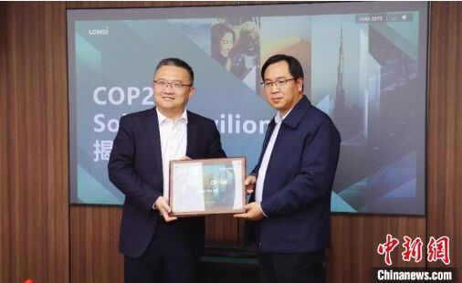 11月21日,中華環(huán)保聯(lián)合會(huì)副秘書(shū)長(zhǎng)李瑞東、隆基綠能品牌總經(jīng)理霍焱在北京共同為Solar+ Pavilion揭幕。(主辦方供圖)