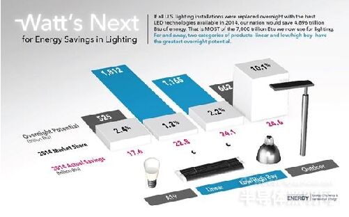 據(jù)悉,美國(guó)能源署(DOE)近日發(fā)布了一份題為《LED在普通照明應(yīng)用中的使用》的報(bào)告。這項(xiàng)報(bào)告不僅估算了2014年LED在10大照明應(yīng)用中的節(jié)能效果,還預(yù)估了這些照明應(yīng)用完全采用LED產(chǎn)品的節(jié)能潛力。 據(jù)報(bào)告顯示,由于LED光源的采用,2014年節(jié)約能源為143萬億英熱單位(相當(dāng)于節(jié)省成本約14億美元),但如果所有應(yīng)用中的通宵照明產(chǎn)品都換成LED光源,將節(jié)約近4,896萬億英熱單位(相當(dāng)于節(jié)省成本490億美元)。 2012-2014,LED在所有應(yīng)用中的安裝量增加,整體增幅超過四倍至215萬,但市場(chǎng)滲透率仍然不大,攀升至3%。小型定向LED光源仍然是市場(chǎng)份額的領(lǐng)先者,從2012年的10%增加到2014年的22%,增長(zhǎng)或在未來幾年放緩。2014年,LED光源占戶外應(yīng)用市場(chǎng)份額為10%,占室內(nèi)應(yīng)用市場(chǎng)份額為2.8%。