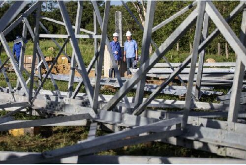 2月14日,在巴西納雄耐爾港,山東電建一公司員工楊官輝(左)和武曉成在施工現(xiàn)場工作。彼時,巴西美麗山水電站特高壓輸電工程二期項目第五標段建設正在納雄耐爾港有序進行。