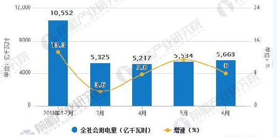 據(jù)前瞻產(chǎn)業(yè)研究院發(fā)布的《電力行業(yè)市場(chǎng)前瞻與投資戰(zhàn)略規(guī)劃分析報(bào)告》最新統(tǒng)計(jì)數(shù)據(jù)顯示,6月份,全國(guó)全社會(huì)用電量5663億千瓦時(shí),同比增長(zhǎng)8.0%。2018每年1-6月份,全國(guó)全社會(huì)用電量32291億千瓦時(shí),同比增長(zhǎng)9.4%,增速比上年同期提高3.1個(gè)百分點(diǎn)。