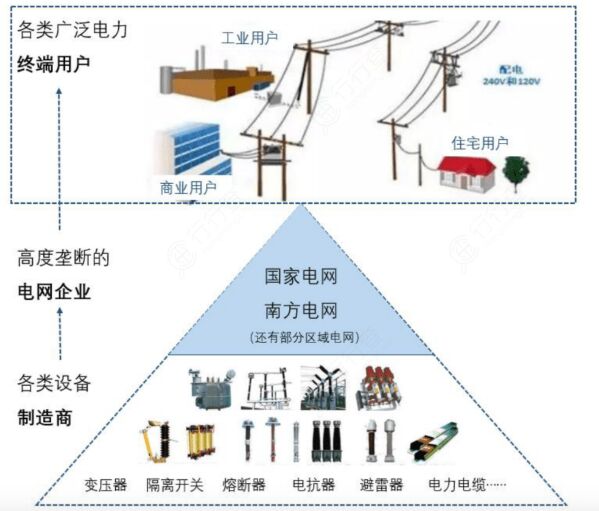 電網(wǎng)產(chǎn)業(yè)鏈下游是廣泛的終端用戶,電網(wǎng)企業(yè)提供輸送電服務(wù),用戶向電網(wǎng)企業(yè)支付電費(目前電網(wǎng)企業(yè)仍然是最主要的售電主體),根據(jù)電價的差異,大致可以將用戶分為:大工業(yè)、一般工商業(yè)、居民以及農(nóng)業(yè)生產(chǎn)四類,其中大工業(yè)和一般工商業(yè)用戶對應(yīng)的電價高于居民和農(nóng)業(yè)生產(chǎn)用電價。 中游是電網(wǎng)建設(shè)及運營,傳統(tǒng)模式下電網(wǎng)企業(yè)進行網(wǎng)架建設(shè)投資,通過購售電價差,收回投資及賺取收益。 電網(wǎng)的上游包括建設(shè)環(huán)節(jié)的設(shè)備企業(yè)和運營環(huán)節(jié)的發(fā)電企業(yè)。其中電力設(shè)備企業(yè)不僅有硬件設(shè)備,也包括軟件,系統(tǒng)集成等。