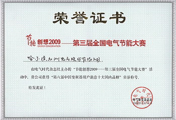 由電氣時(shí)代雜志社主辦,中國(guó)電機(jī)工程學(xué)會(huì)、中國(guó)電器工業(yè)協(xié)會(huì)變頻器分會(huì)、中國(guó)自動(dòng)化學(xué)會(huì)協(xié)辦的“節(jié)能創(chuàng)想2009——第三屆全國(guó)電氣節(jié)能應(yīng)用技術(shù)論壇及第六屆變頻器用戶(hù)滿(mǎn)意十大品牌發(fā)布”在北京舉行。哈爾濱九洲電氣股份有限公司被評(píng)為“十大品牌”之一。此次發(fā)布會(huì)有來(lái)自電力、石化、冶金、水處理、水泥、煤炭、建筑、交通、紡織和通用機(jī)械等領(lǐng)域的專(zhuān)家及用戶(hù)代表等180多人參加。