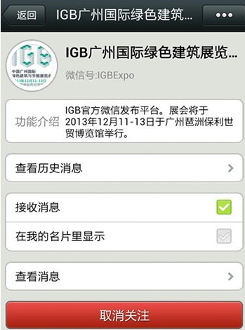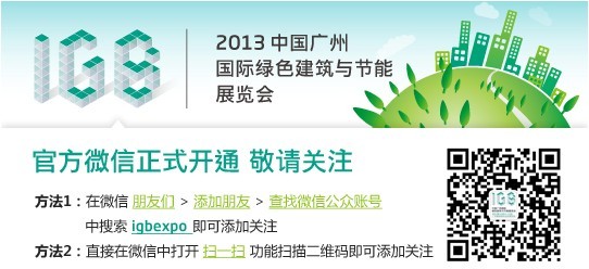 廣州綠色建筑展,2013年12月11日-13日在廣州琶洲保利世貿博覽館隆重開幕。目前已啟動官方預登記(http://www.igbchina.com/can-guan-yu-deng-ji-2/),登記即有六重好禮大贈送,只限前1000名。輕輕動下手指趕快關注廣州綠建展吧。 您可以通過以下方式關注廣州綠色建筑展: 方法一: 打開添加朋友頁面—查找微信公眾賬號